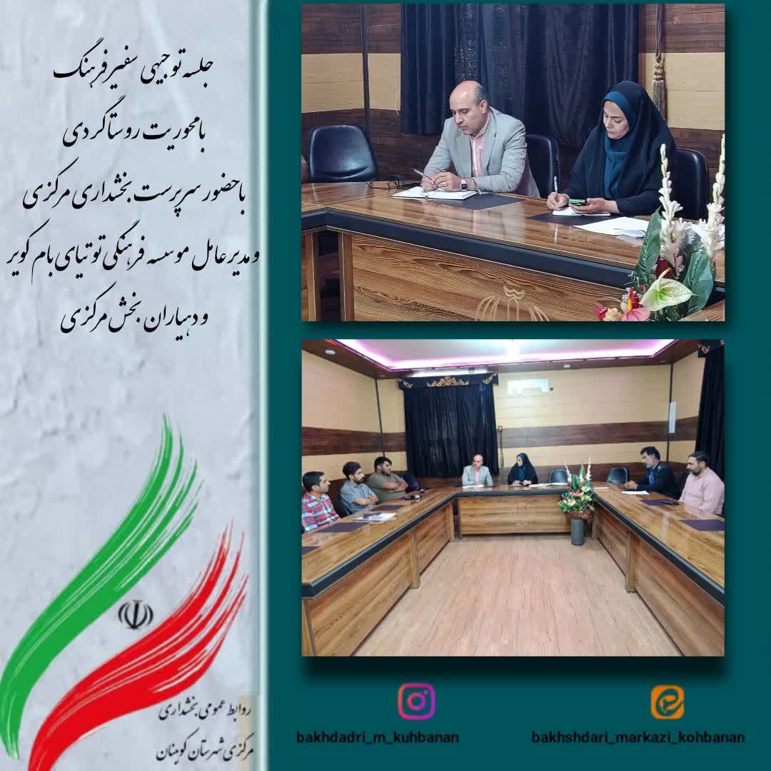در این جلسه، محمدجواد اکبری مدیرعامل موسسه فرهنگی هنری توتیای بام کویر ضمن قدردانی از تلاشهای بخشدار و دهیاران، طرح ابتکاری «سفیر فرهنگ» را تشریح کرد.