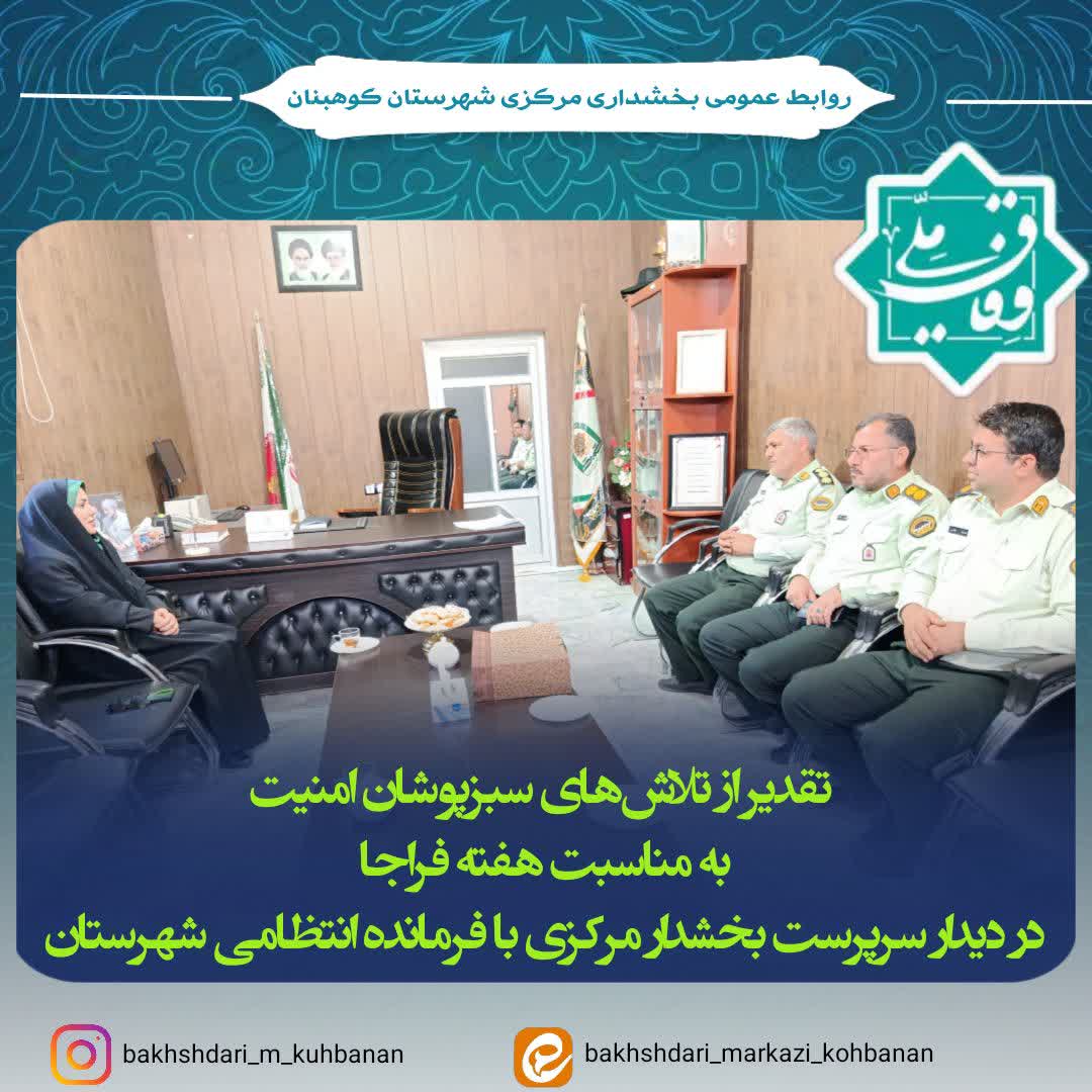 سرپرست بخشداری مرکزی کوهبنان به مناسبت هفته نیروی انتظامی با حضور در ستاد فرماندهی انتظامی شهرستان کوهبنان از تلاشهای بیوقفه سرهنگ محمودزاده و همکارانشان در نیروی انتظامی در برقراری نظم و امنیت قدردانی کرد.