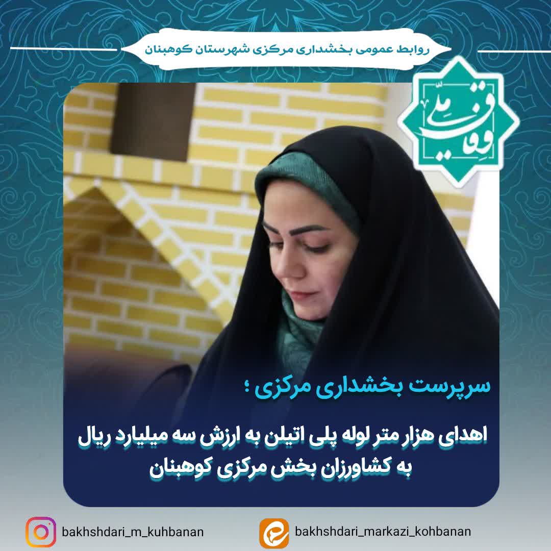 صدیقه ایزدی سرپرست بخشداری مرکزی کوهبنان در گفت و گو با واحد روابط عمومی بخشداری مرکزی بیان داشت : در راستای حمایت از بخش کشاورزی و بهبود زیرساختهای آبی روستاها، تعدادی لوله انتقال آب پلی اتیلن با اعتباری قریب به سه میلیارد ریال به کشاورزان مناطق روستایی بخش مرکزی اهدا شد.