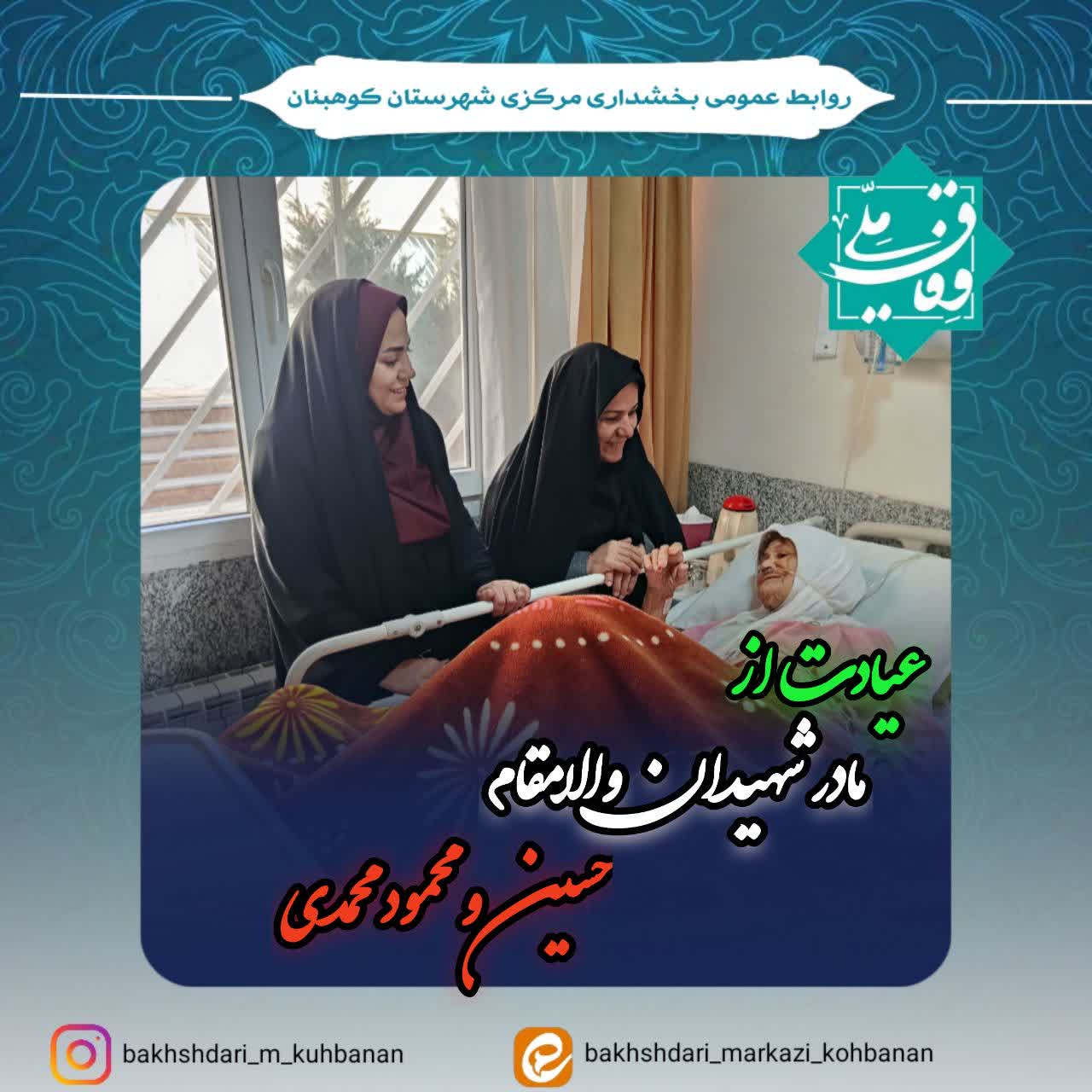 صبح امروز سرپرست بخشداری مرکزی شهرستان کوهبنان بههمراه رئیس اداره بنیاد شهید و امور ایثارگران با حضور در بیمارستان ابوحامد کوهبنانی ، از مادر گرانقدر شهیدان والامقام حسین و محمود محمدی عیادت کردند. در این دیدار صمیمانه، بخشدار مرکزی ضمن جویا شدن از وضعیت سلامتی این مادر فداکار، با تجلیل از مقام والای شهدا و ایثار خانوادههای معظم آنان، صبر و استقامت این خانواده معزز را ستودند و بر تداوم توجه و تکریم خانوادههای شهدا تأکید کردند. وی از کادر درمان بیمارستان تقاضا نمود نهایت خدمت رسانی در راستای رفع کسالت و بیماری مادر بزرگوار تا بهبود سلامتی کامل را داشته باشند چرا که مادران شهدا چشم و چراغ این کشور هستند و حضورشان باعث خیر و برکت است.