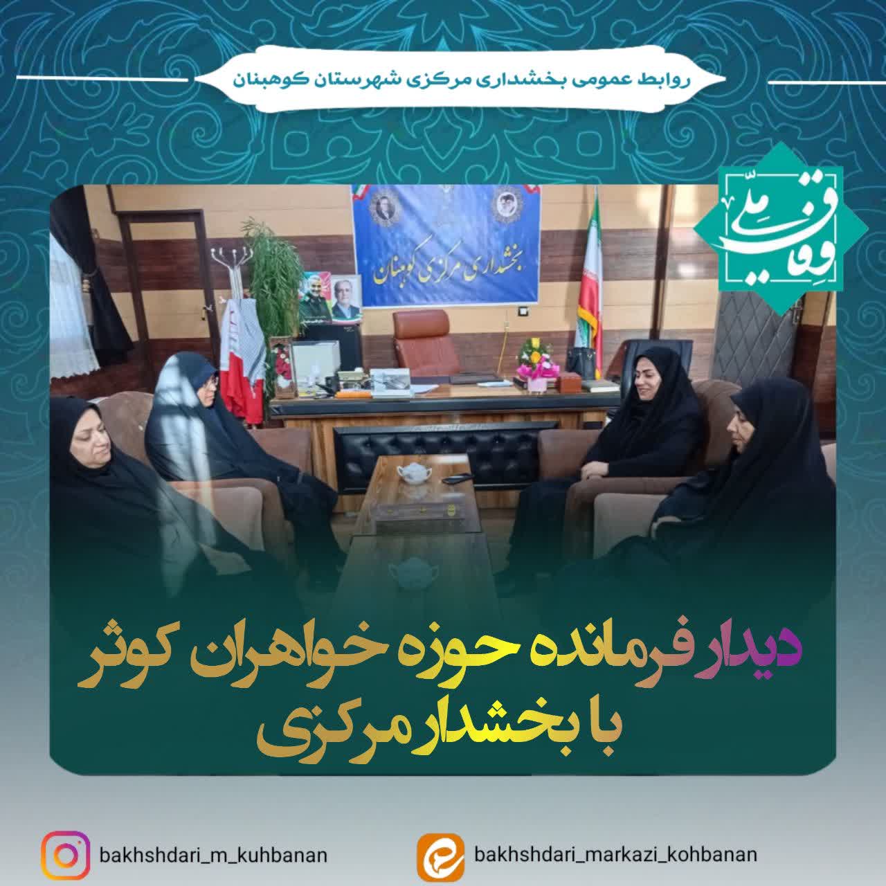 صبح امروز در راستای تقویت همکاریها و تبادل نظر در زمینههای اجتماعی و فرهنگی، خانم توکلی، فرمانده حوزه خواهران کوثر کوهبنان، به همراه شورای حوزه و مربیان صالحین، در بخشداری کوهبنان با خانم ایزدی، بخشدار مرکزی کوهبنان دیدار کردند.