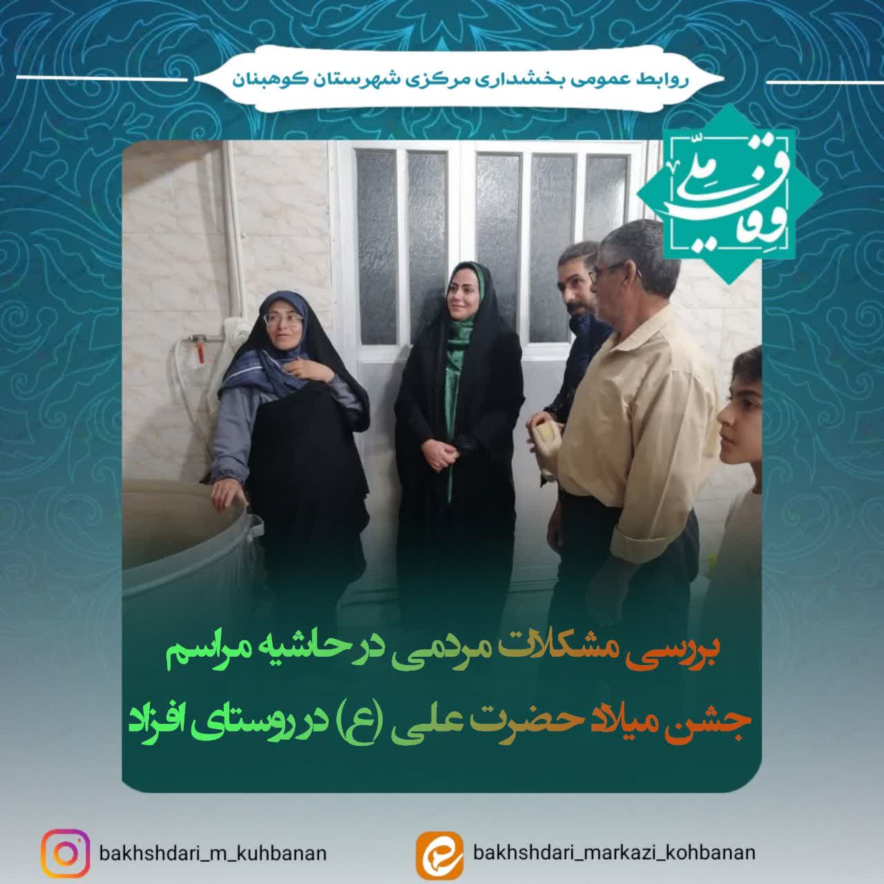 به گزارش روابط عمومی بخشداری مرکزی کوهبنان، در حاشیه مراسم جشن میلاد با سعادت مولای متقیان، امیرالمؤمنین حضرت علی علیهالسلام، در روستای افزاد، صدیقه ایزدی سرپرست بخشداری مرکزی کوهبنان ضمن حضور در جمع مردم، به بررسی مستقیم مسائل و مشکلات اهالی این روستا پرداخت.