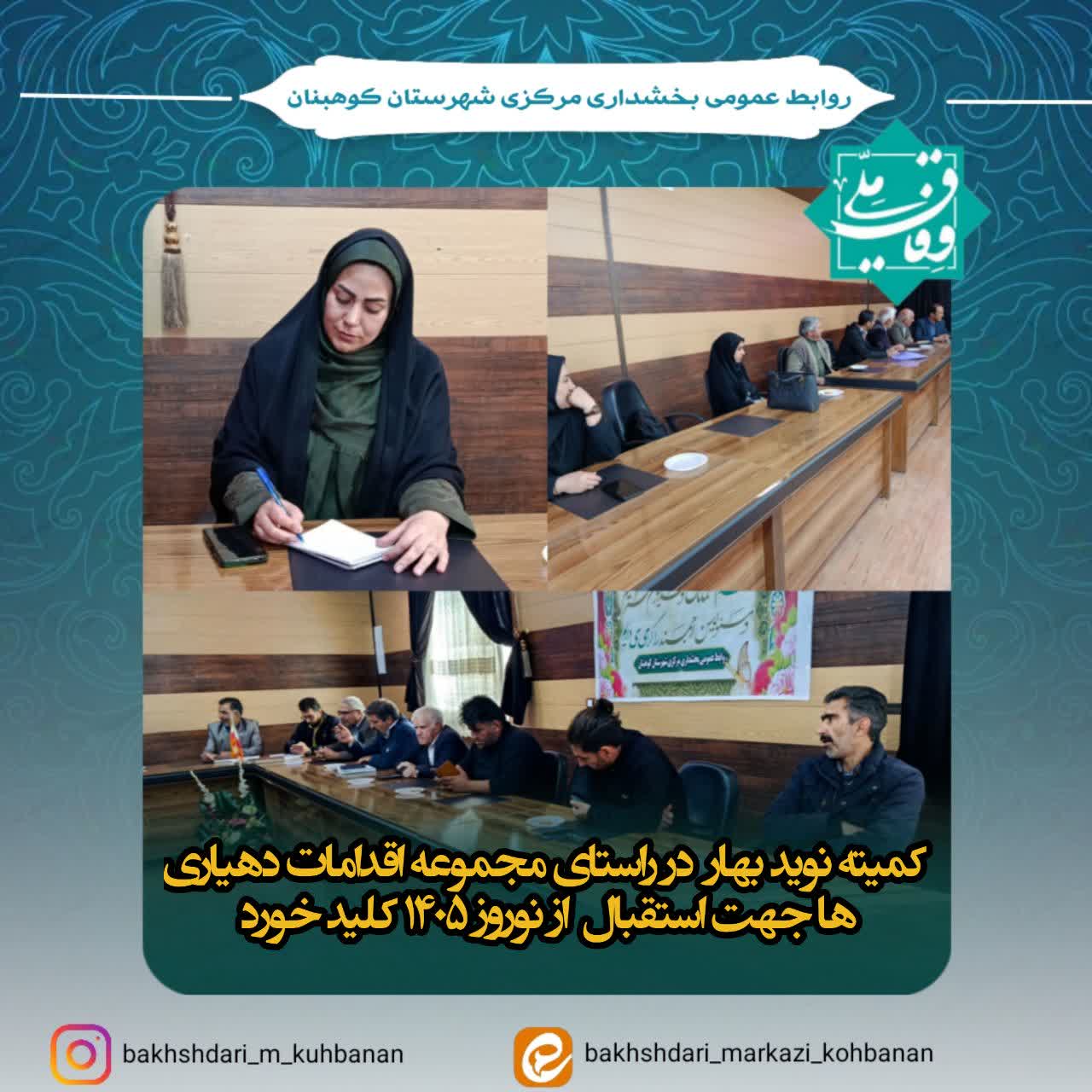 اولین جلسه کمیته نوید بهار با حضور صدیقه ایزدی سرپرست بخشداری مرکزی کوهبنان، روسای شورای اسلامی روستاها، دهیاران و کارشناس فنی دهیاری ها با محوریت ضرورت برنامهریزی و اجرای دقیق اقدامات دهیاریها در حوزه عمرانی، خدماتی و فرهنگی بهمنظور استقبال شایسته از فصل بهار و ایام نوروز ۱۴۰۵ در محل سالن کنفرانس بخشداری برگزار گردید.