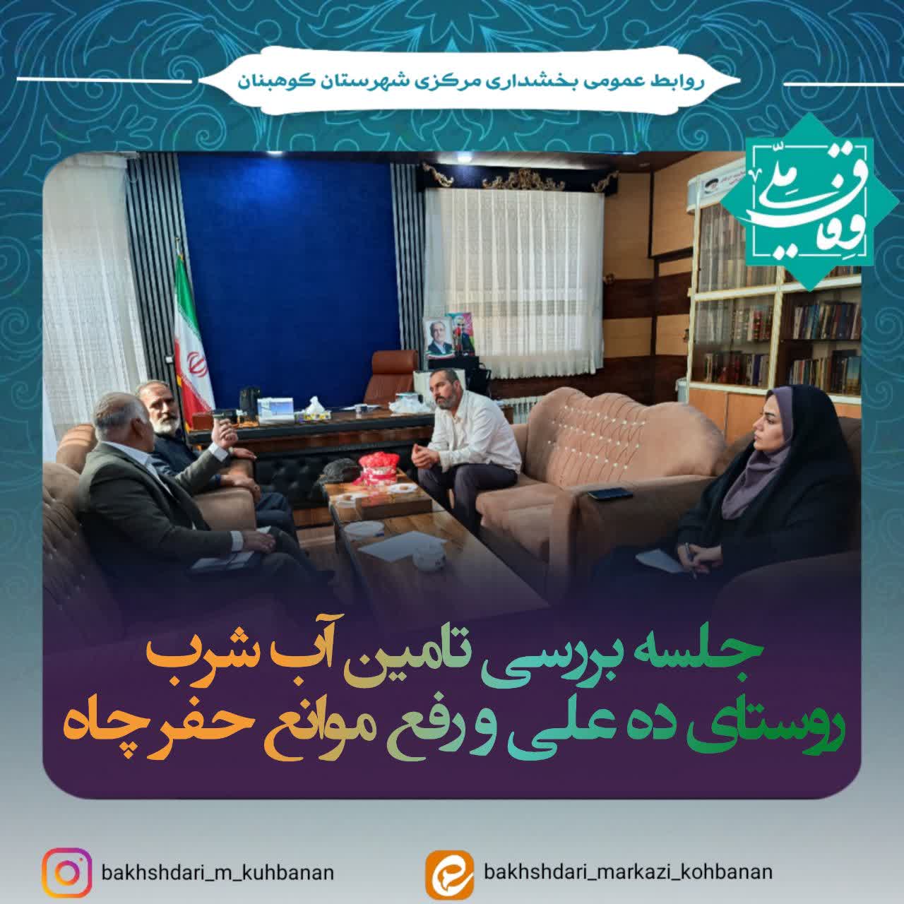 جلسه بررسی تأمین آب شرب روستای دهعلی و رفع موانع حفر چاه، با حضور بخشدار مرکزی، رئیس اداره آب و فاضلاب و رئیس شورای اسلامی روستای دهعلی برگزار شد.